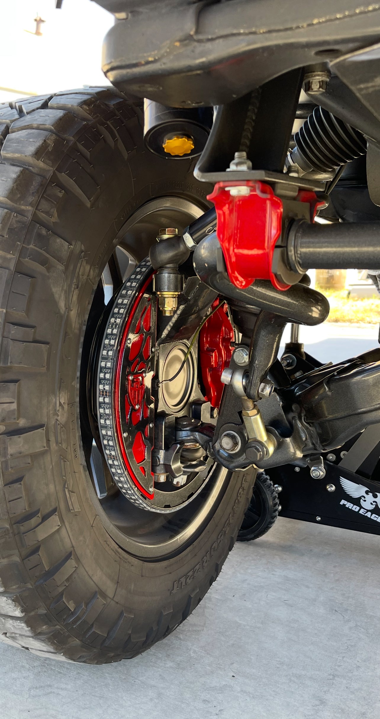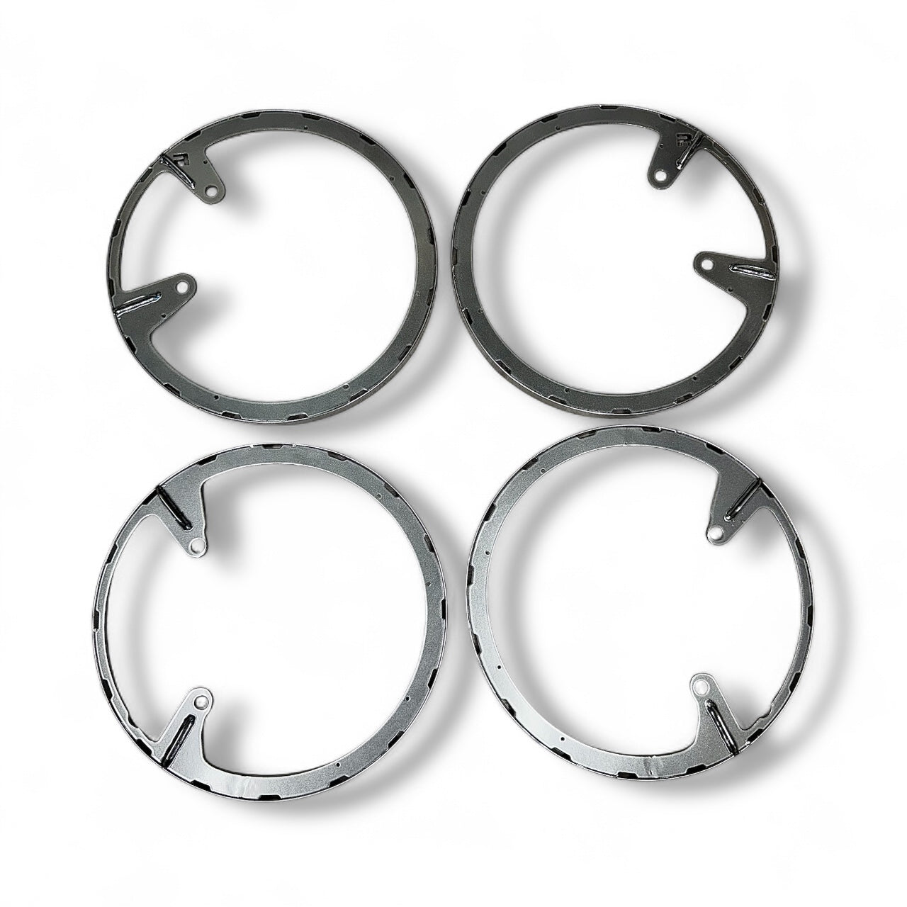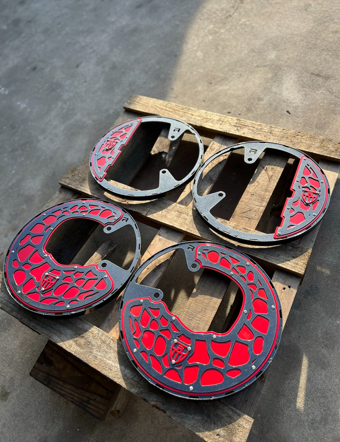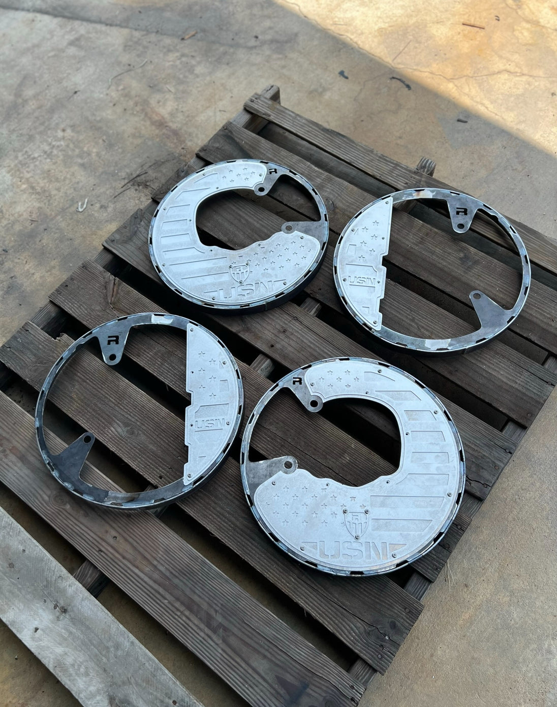 These Wheel Ring Brackets are a simple way to add wheel lights to your setup. They are made out of 14ga stainless steel with 10ga ring to add wheel lights on and have 2 layers that simply unbolt for ease to powder or mirror stainless overlays. They do not require any holes to be drilled. Simply bolts onto the brake caliper bolts for an easy install. We can add a custom logo/wording in them for an extra fee. Please upload the file you would like to integrate in the overlays. We will send a completed rendering for you to confirm before the overlays are cut.